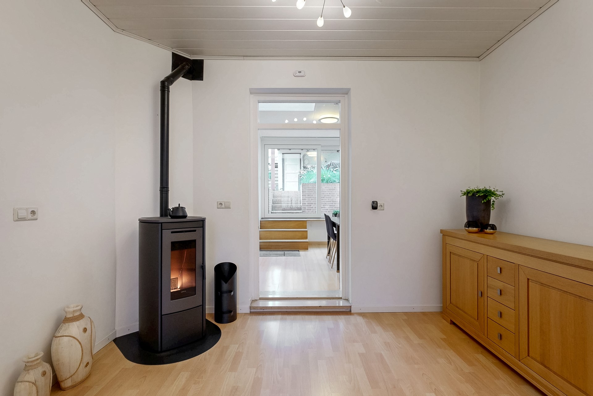 De hal geeft toegang tot de woonkamer ensuite met laminaatvloer, schuifpui naar de tuin en pelletkachel (ter overname) en een airco unit voor extra comfort koelen en verwarmen. Het achterste gedeelte is nu ingedeeld als eetkamer en het voorste gedeelte is momenteel de gezellige zitkamer. De eetkamer geeft toegang tot de keuken en een functioneel tussenportaal.