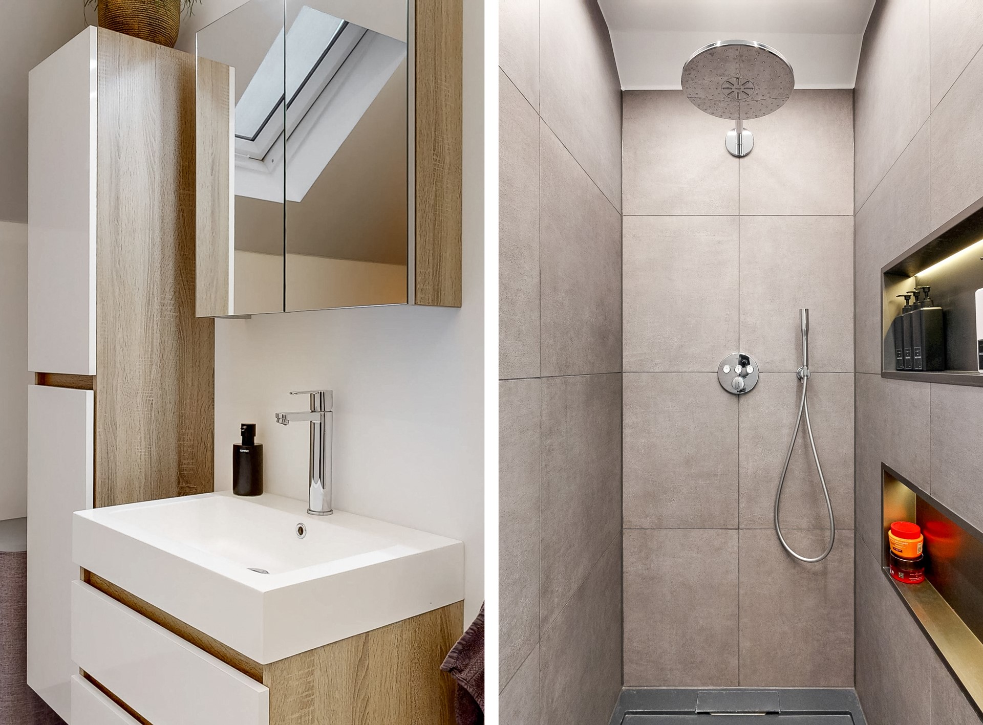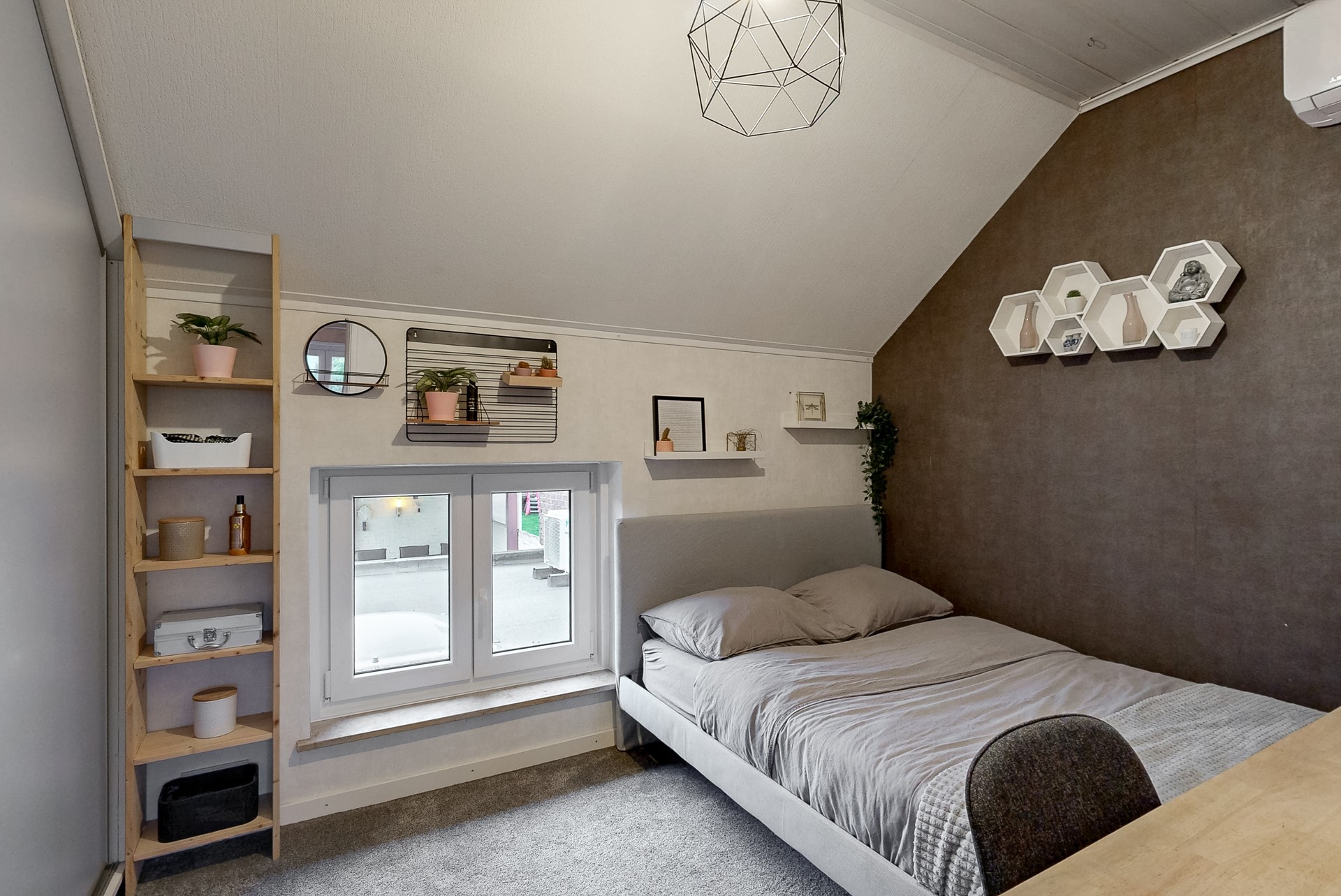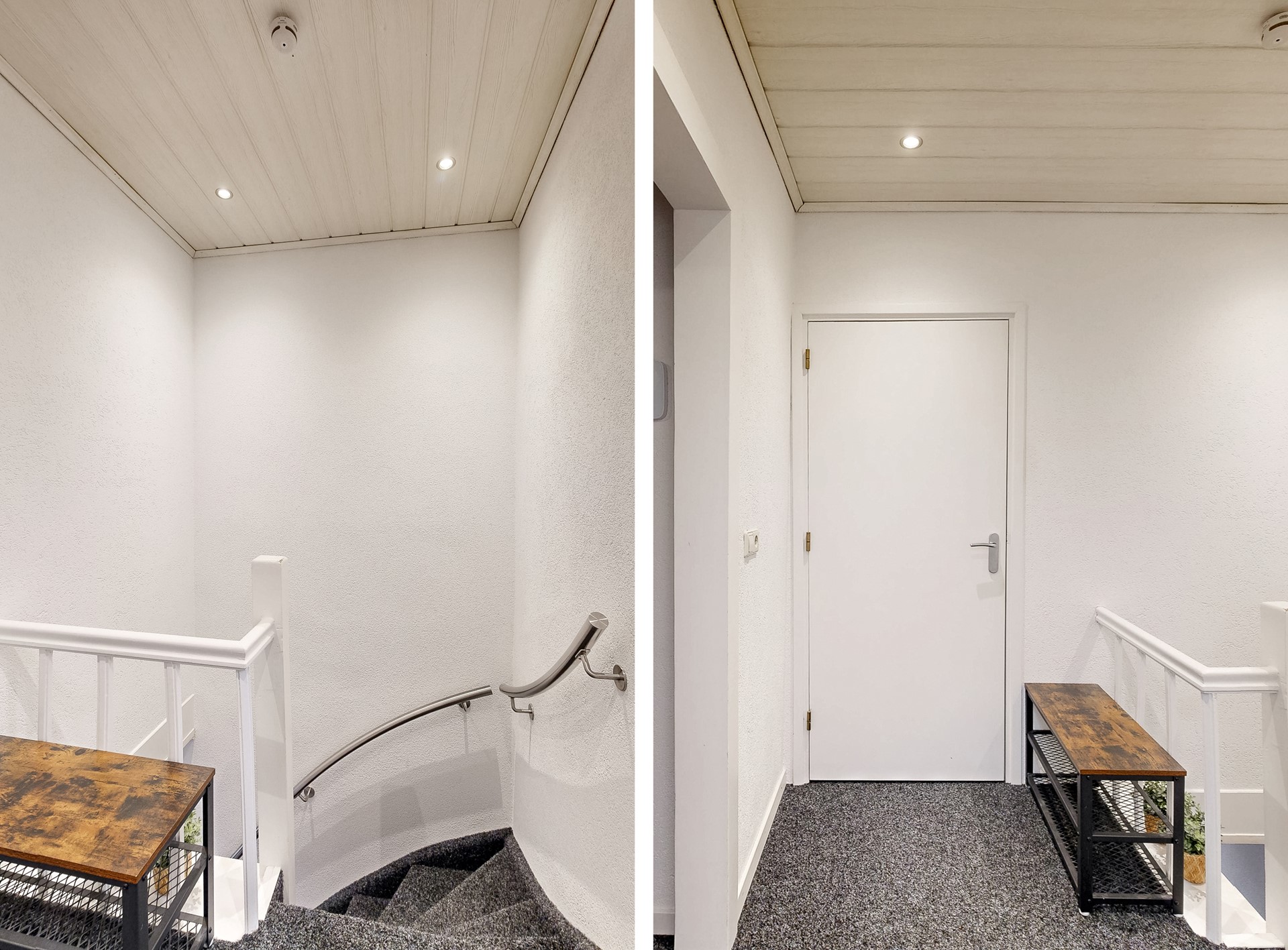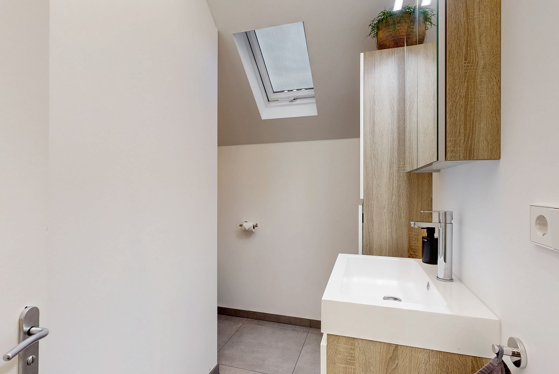 De overloop geeft toegang tot de 3 slaapkamers en moderne badkamer. De badkamer is vernieuwd en voorzien van inloopdouche, wastafel, infrarood paneel en 2de toilet.