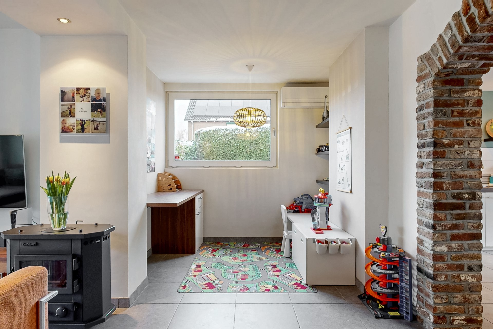 De hal geeft toegang tot de ruime woonkamer en keuken. De gezellige woonkamer heeft een houtkachel en een airco-unit voor extra comfort.