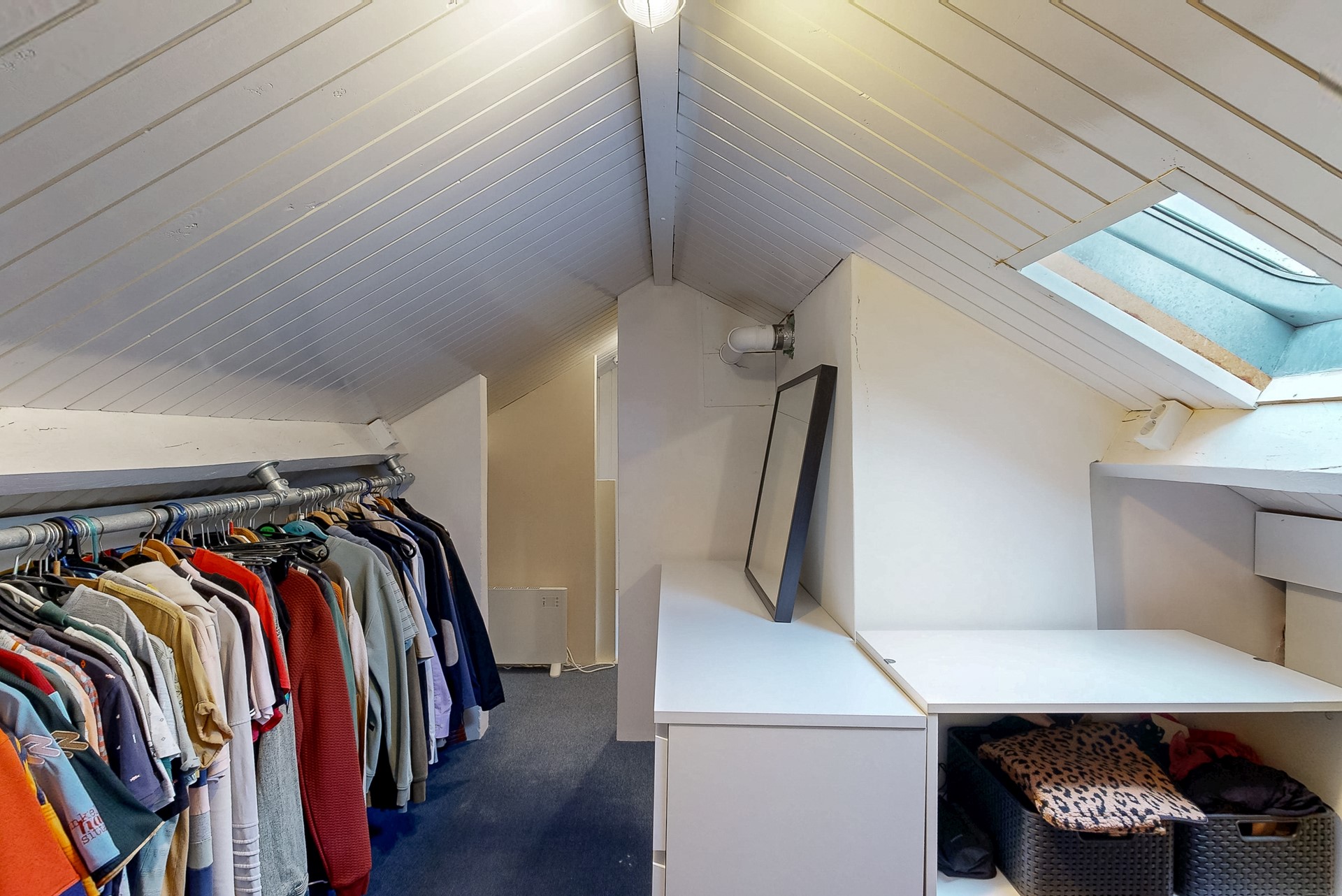 De zolder heeft een dakraam en is bereikbaar met een vaste trap en momenteel in gebruik als kleedkamer en berging.