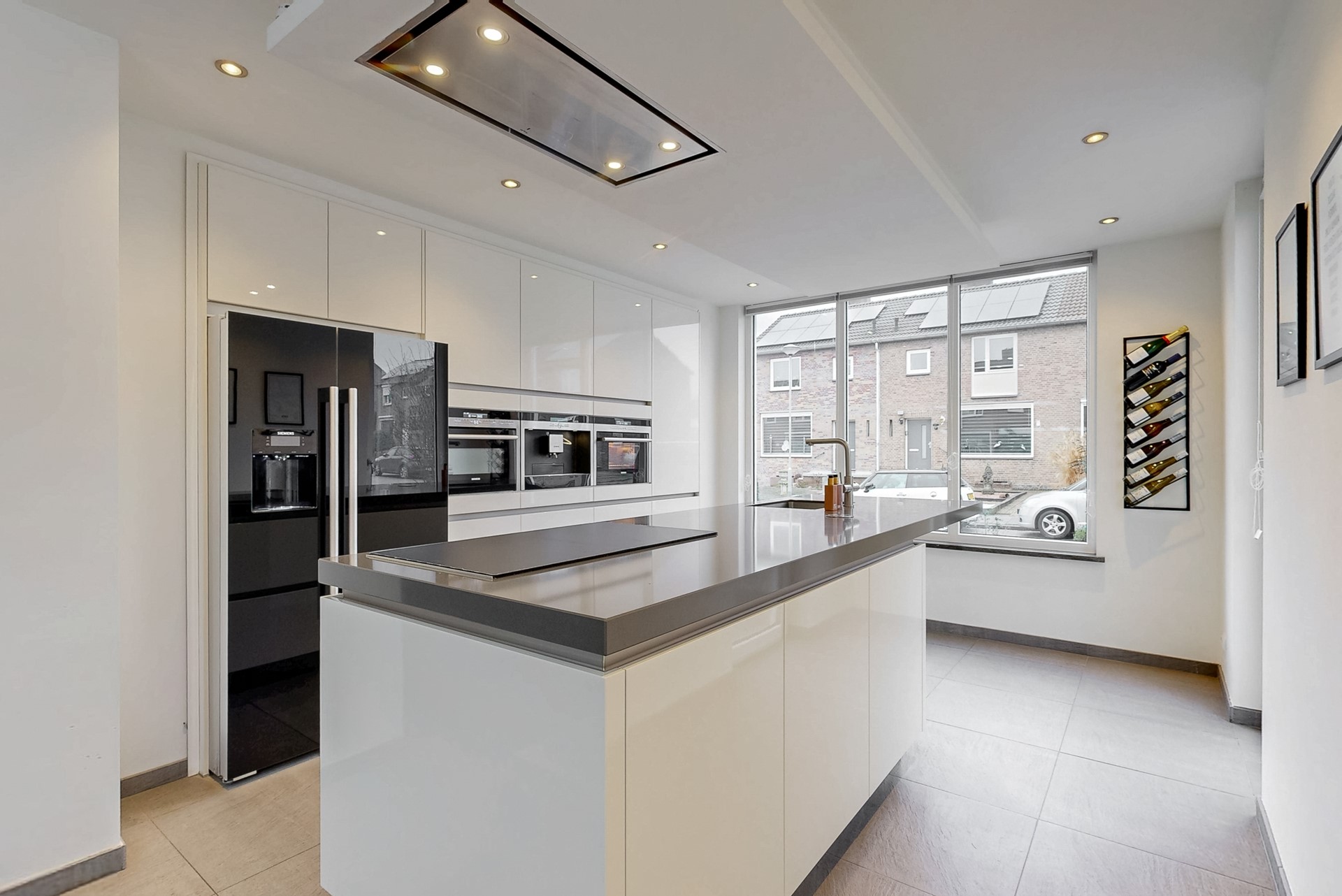 De keuken is voorzien combi oven magnetron, combi stoom oven, koffiemachine, Amerikaanse koelkast met diepvries, gekoeld water, ijsblokjes en shaved ice, vaatwasser, Quooker, inductie kookplaat met 5 zones en een afzuigkap.