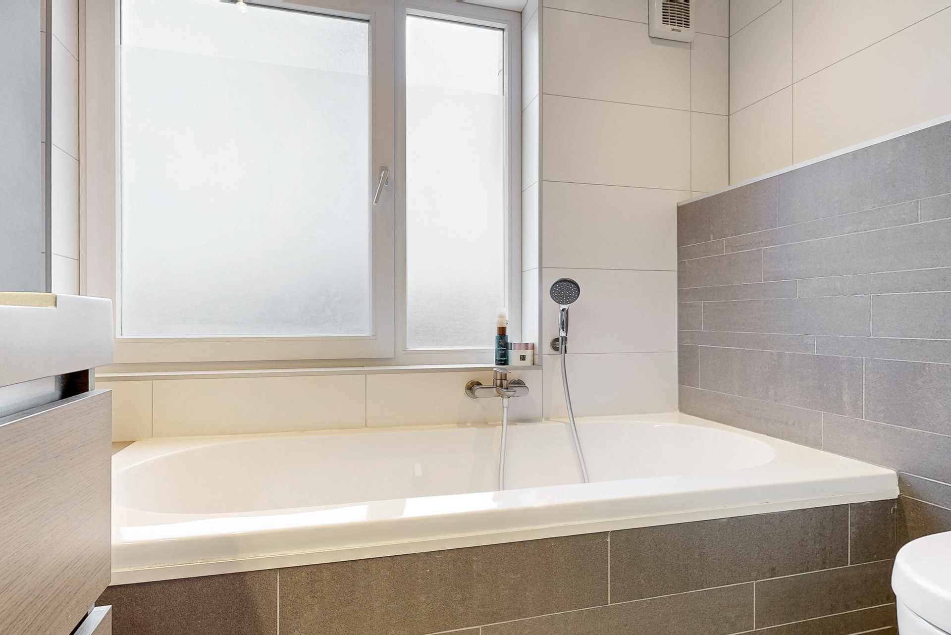 De overloop geeft toegang tot 2 slaapkamers en de moderne, luxe badkamer met 2de toilet, separate douche, ligbad, dubbele wastafel in meubel.