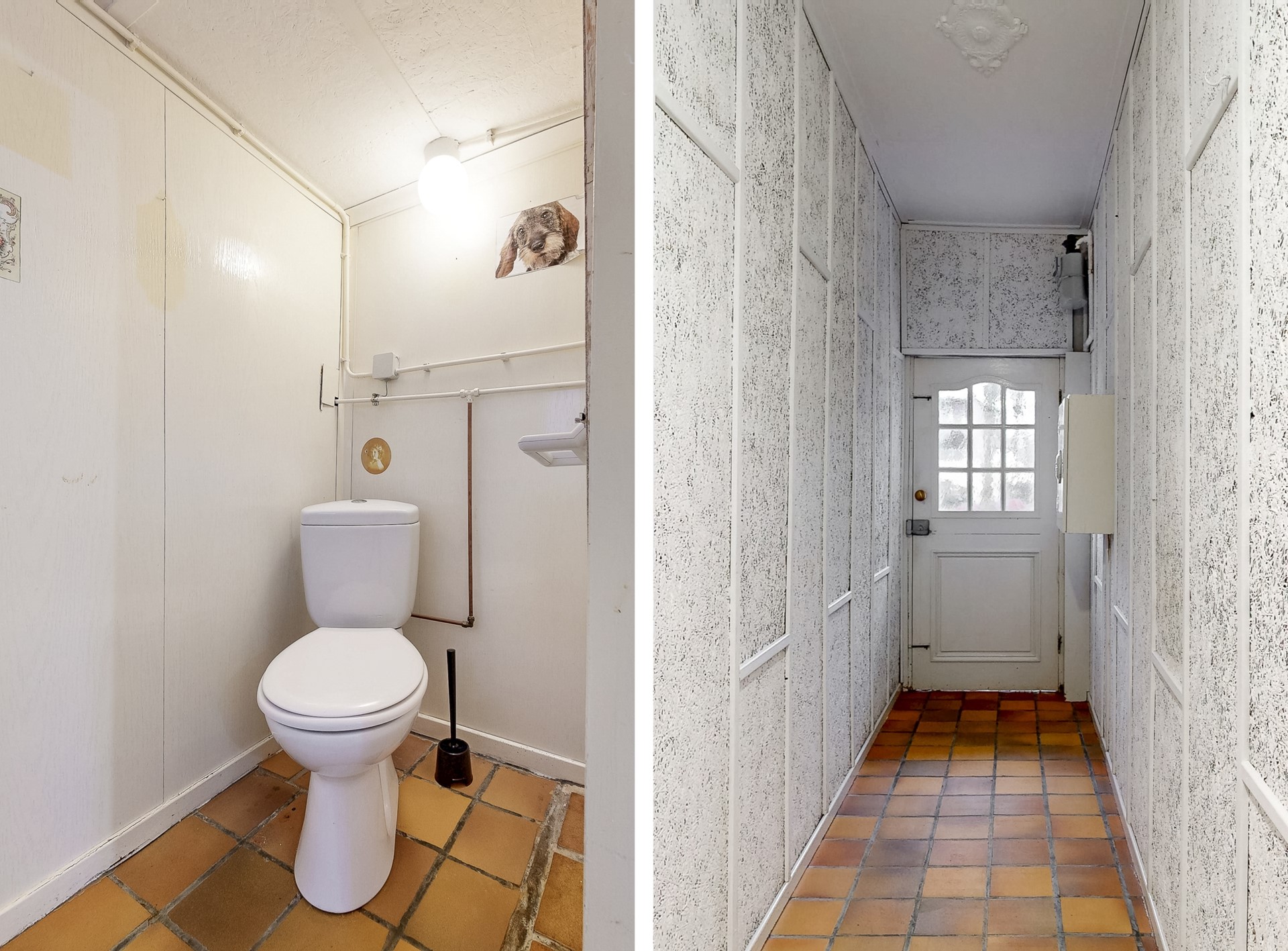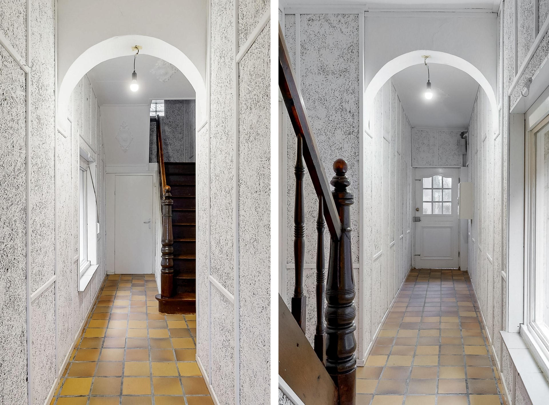 De hal is voorzien van de originele meterkast, toegang tot de woonkamer en toegang tot de toiletruimte met doorgang naar de kelder.