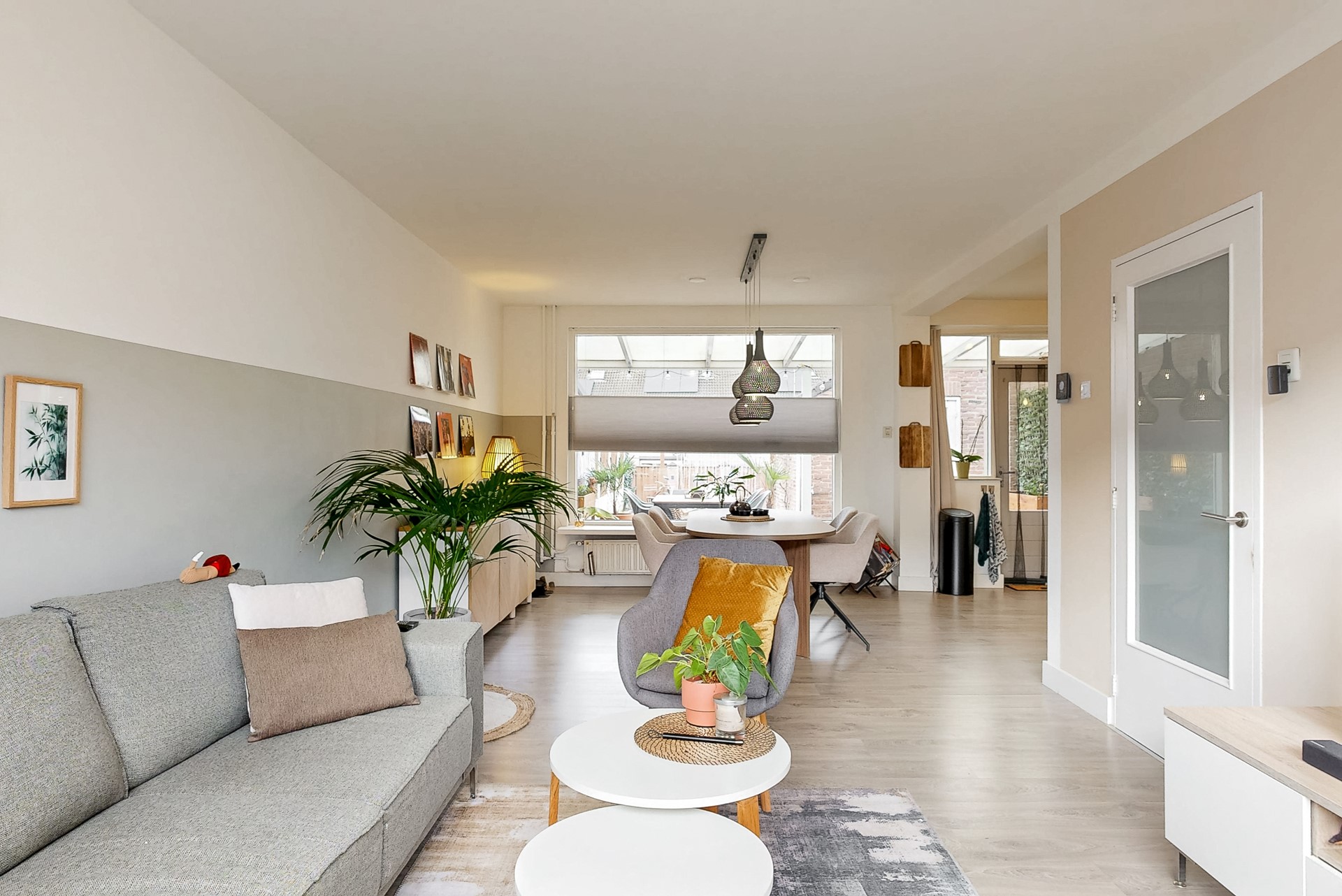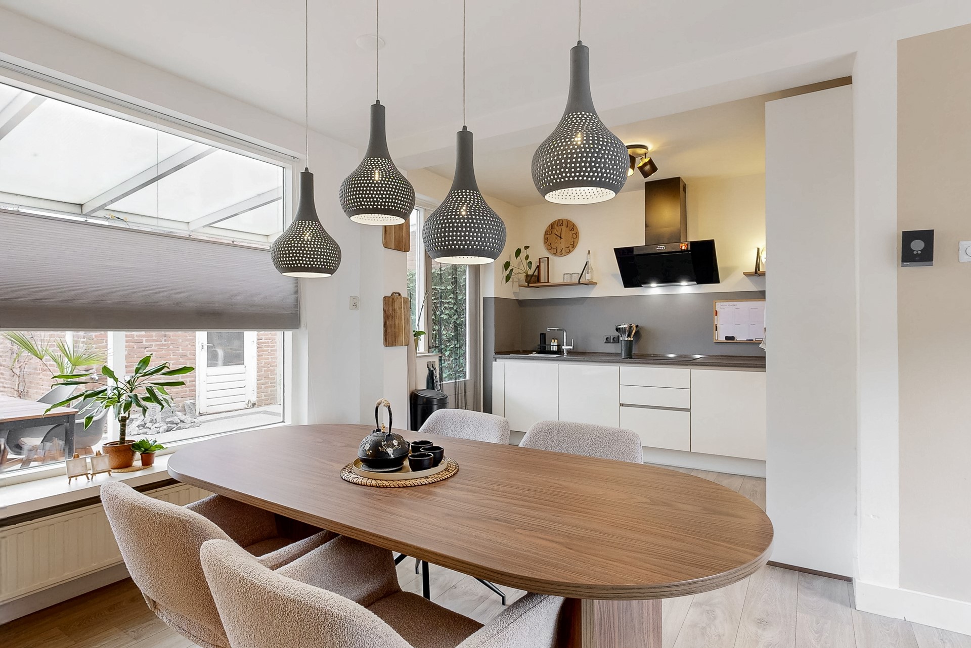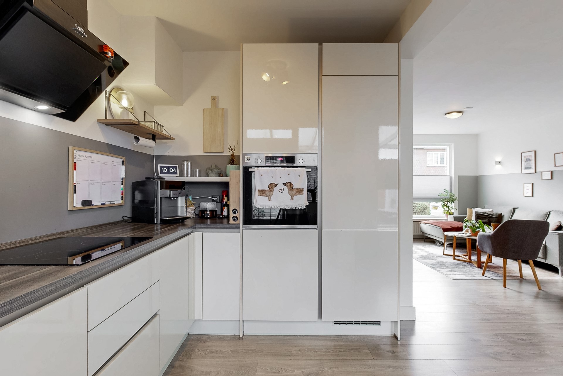 De woonkamer staat in open verbinding met de nette keuken voorzien van afzuigkap, koelkast, vaatwasser en