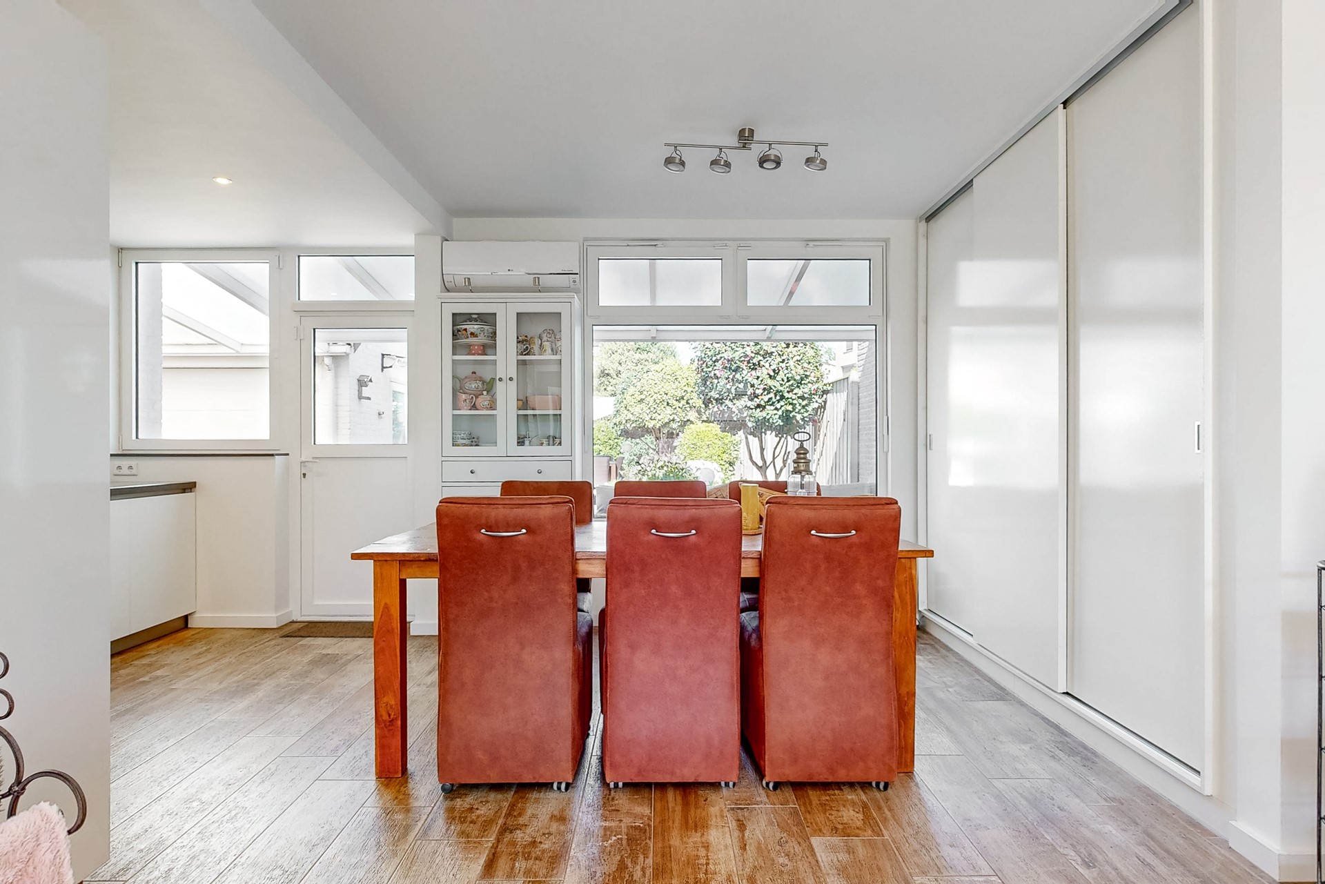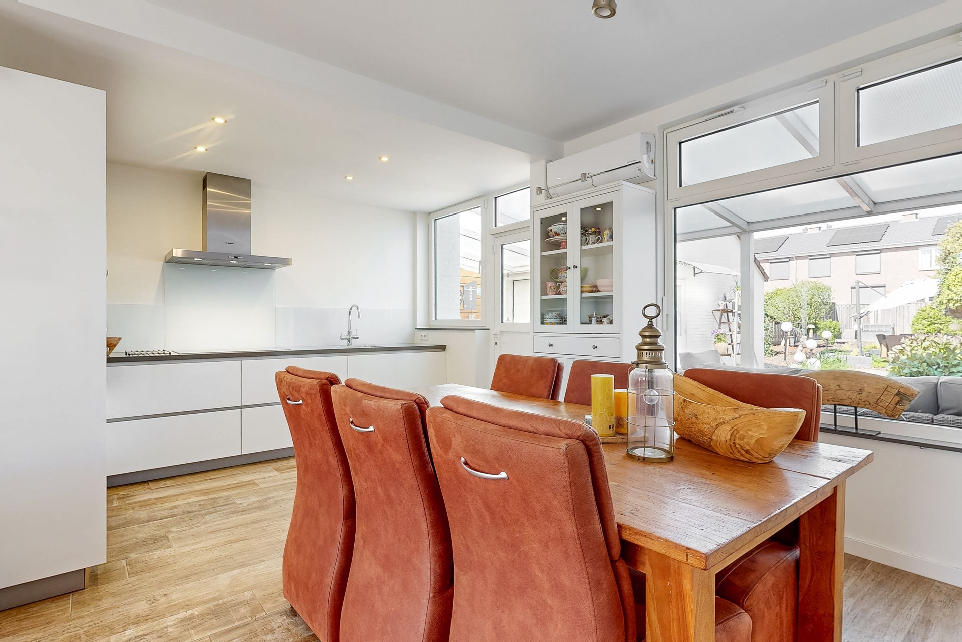 De hal geeft eveneens toegang tot de lichte woonkamer met open keuken, deur naar tuin, schuifkastenwand en airco. De moderne keuken (STIJL keukens) is voorzien van een composieten aanrechtblad, inductiekookplaat, afzuigkap, koelkast, vaatwasser, kokend water kraan en combi-oven en een (stoom)oven.