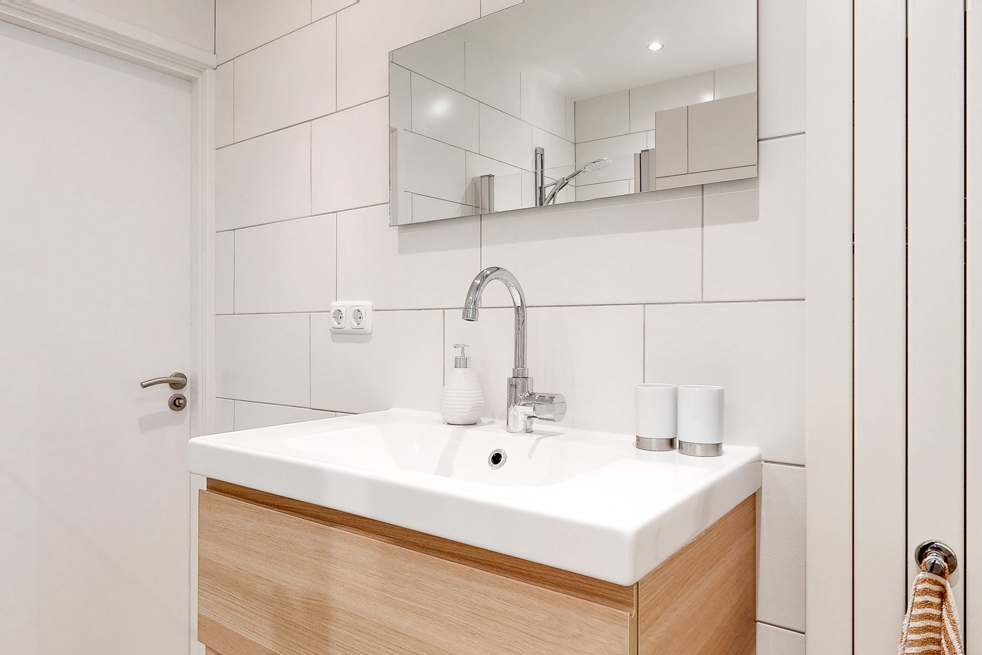 De badkamer is voorzien van een inloopdouche, toilet en wastafel.