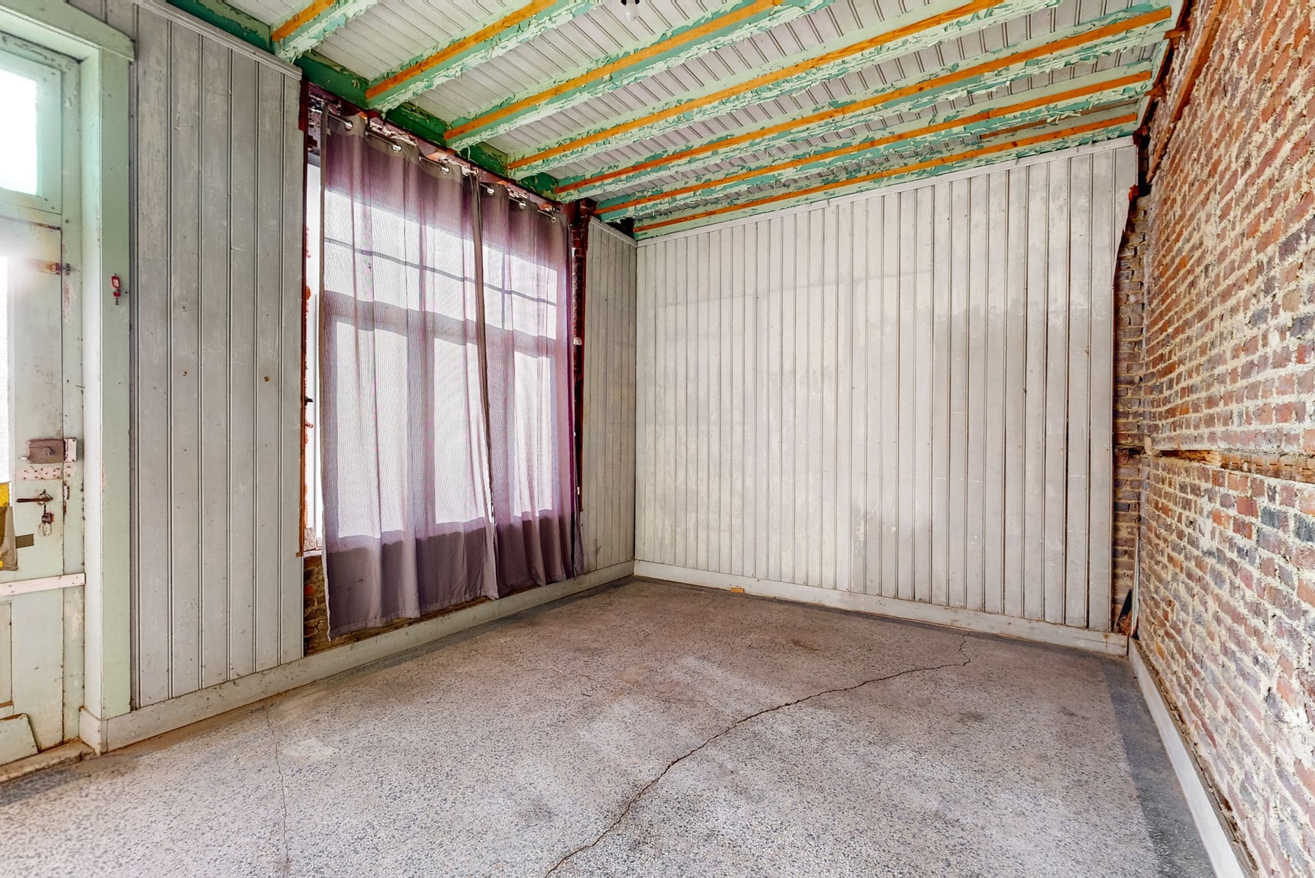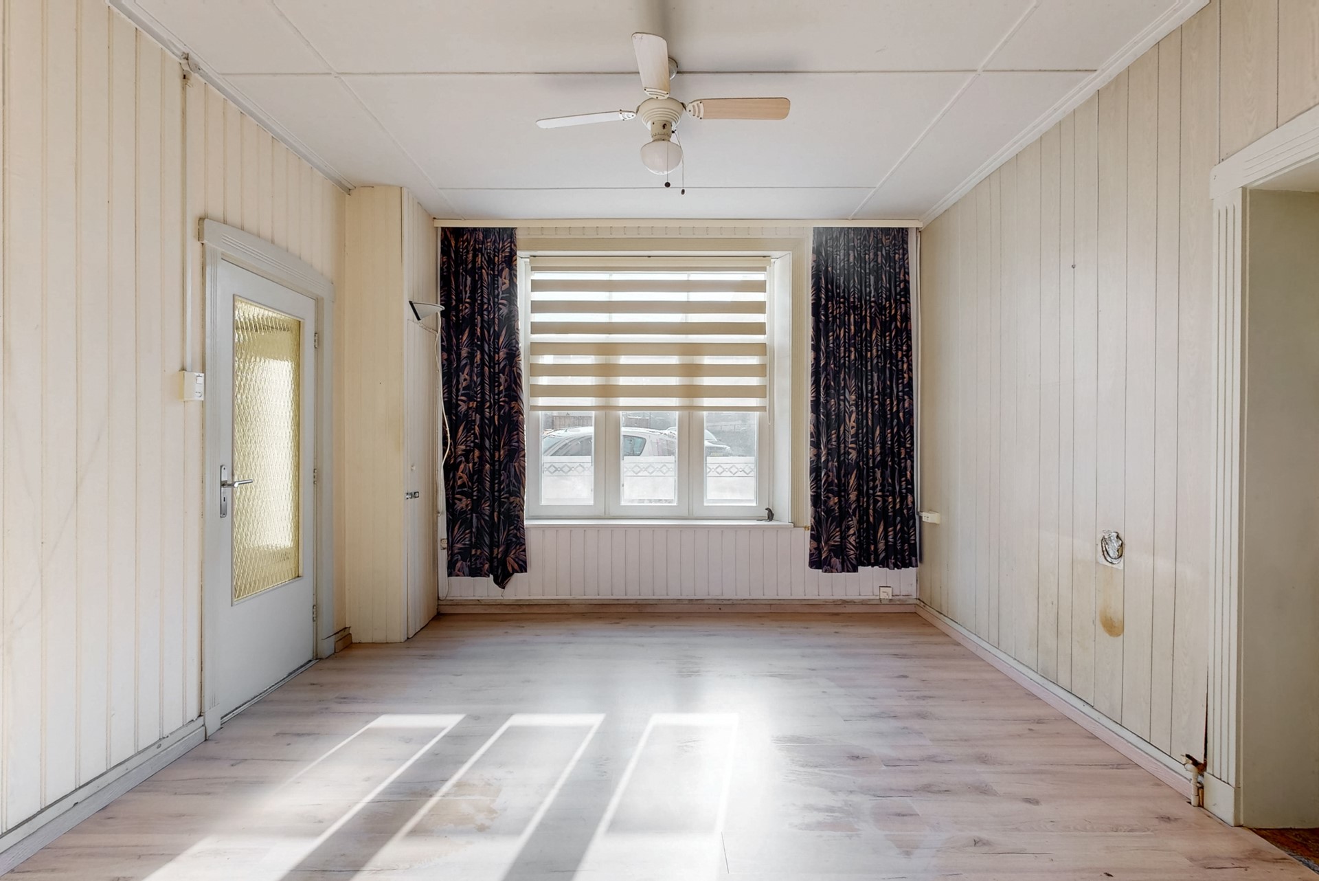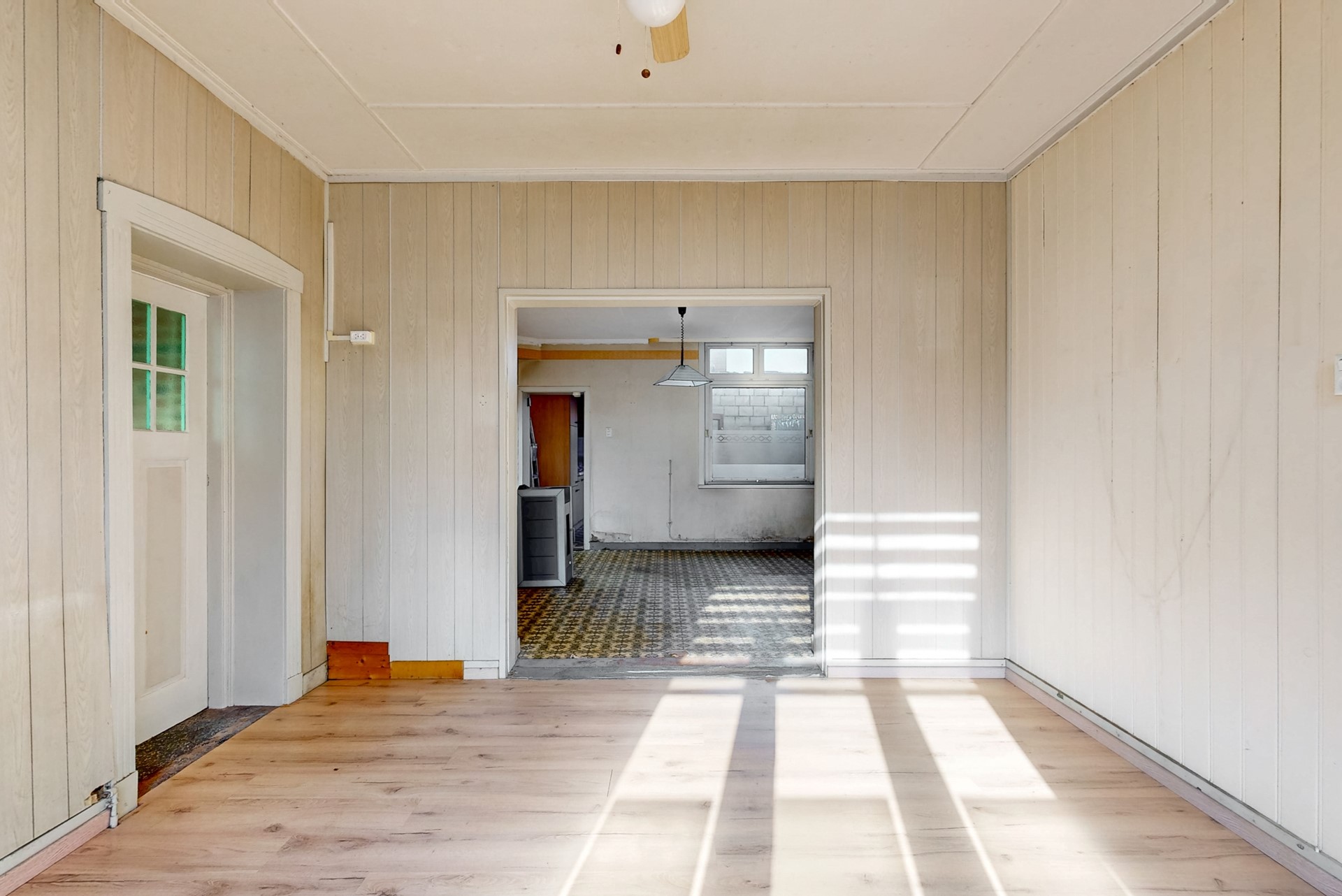 De woonkamer is vroeger ‘ensuite’ geweest en dat is nog zichtbaar. Aan de linkerzijde is nog een grote ruimte, vroeger was dit winkel met een eigen ingang.
