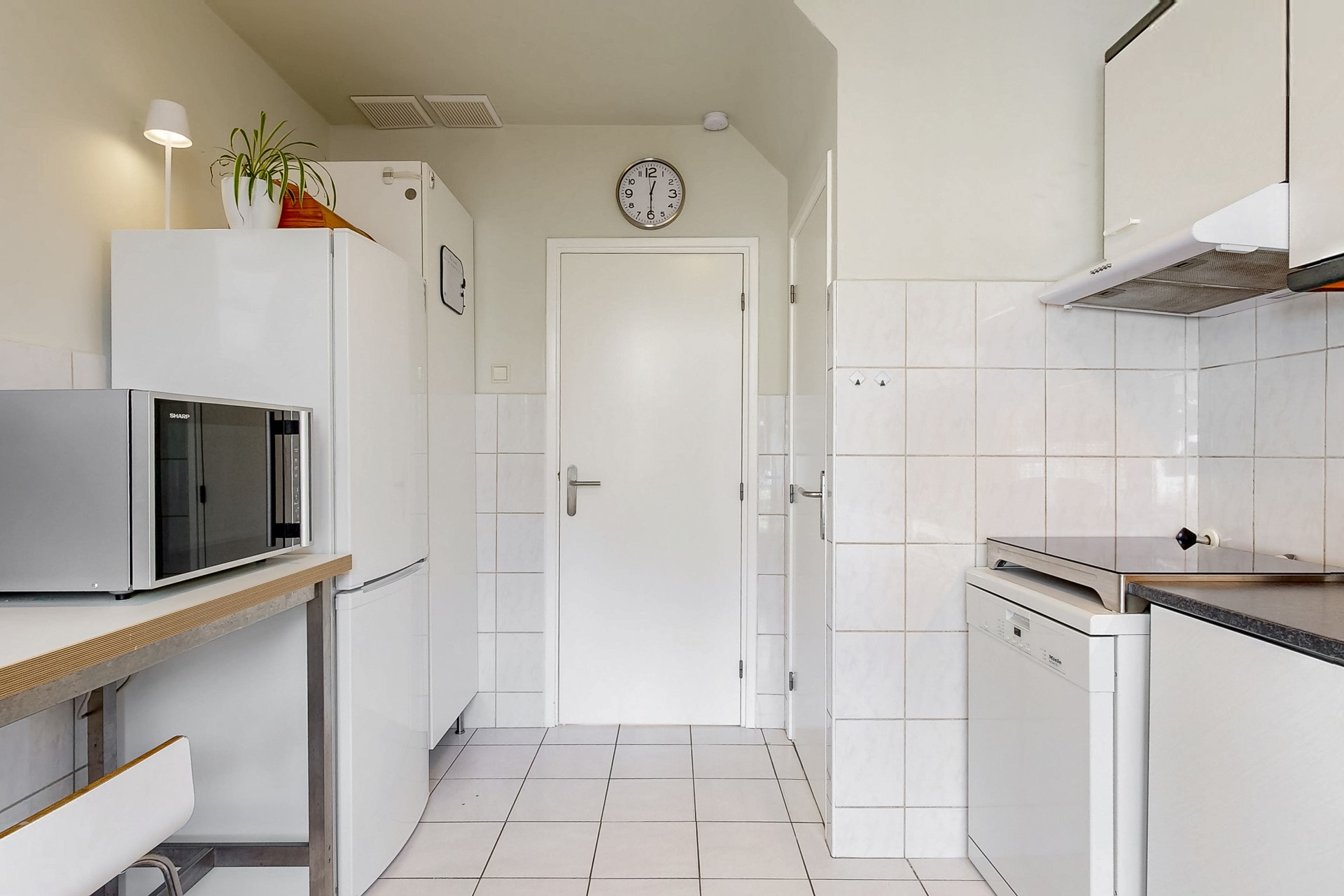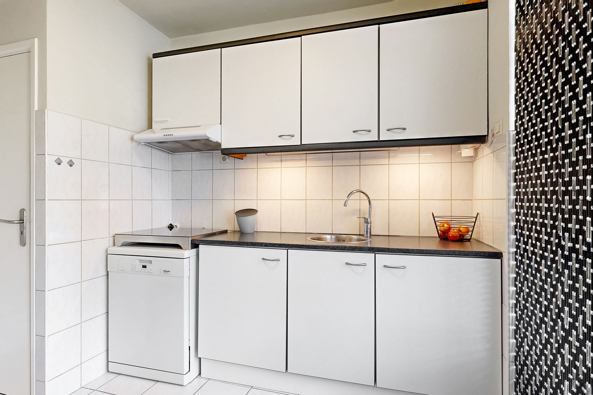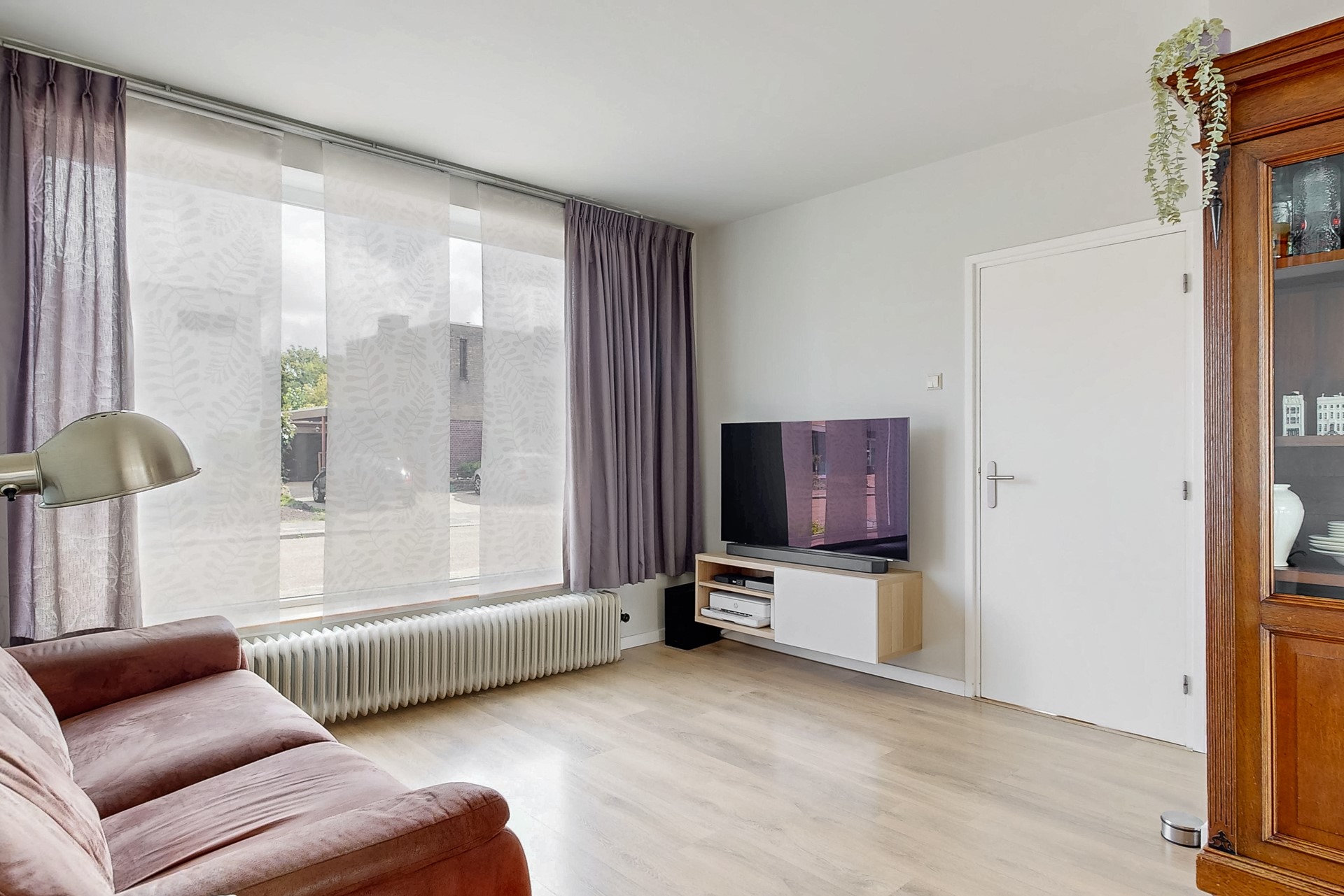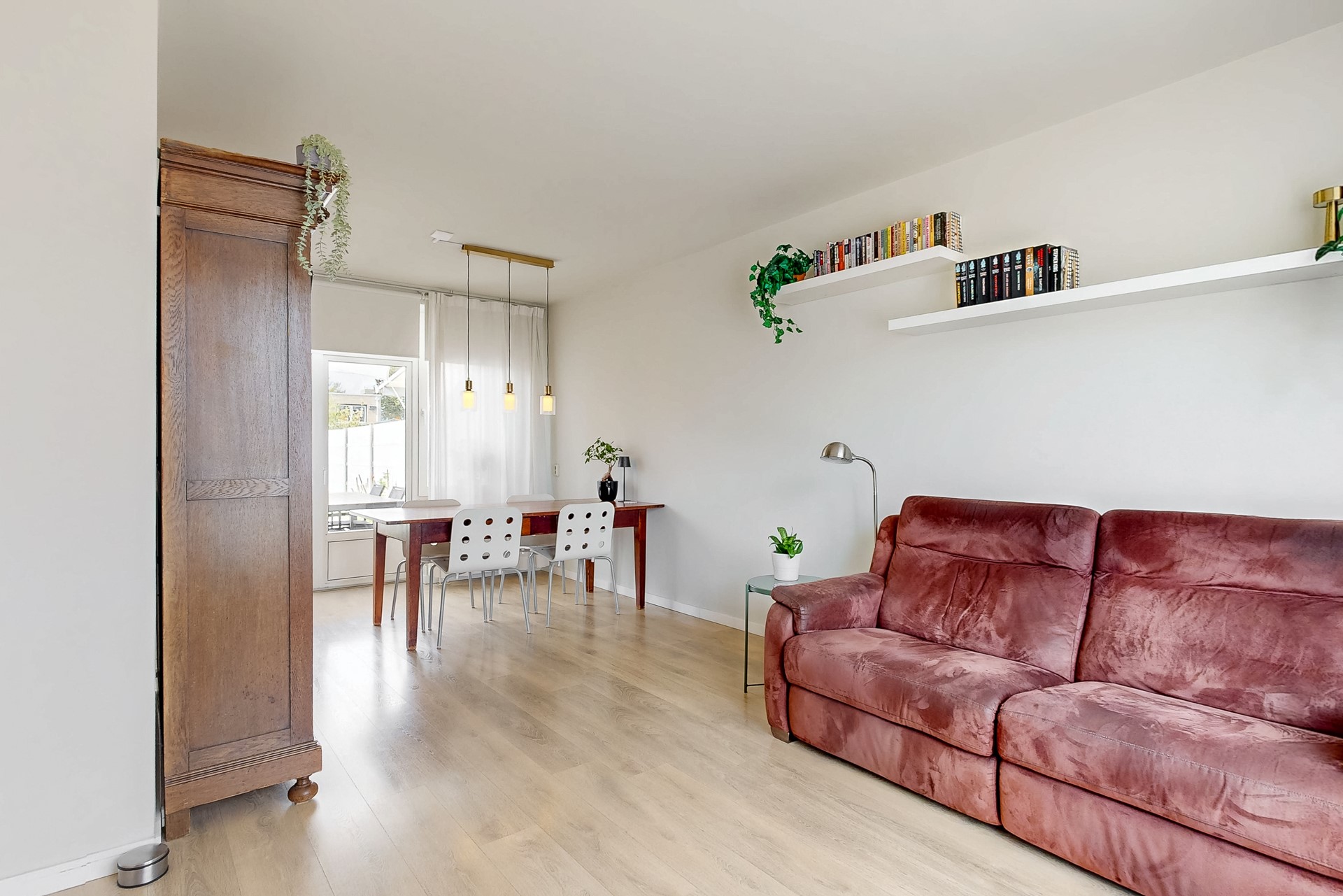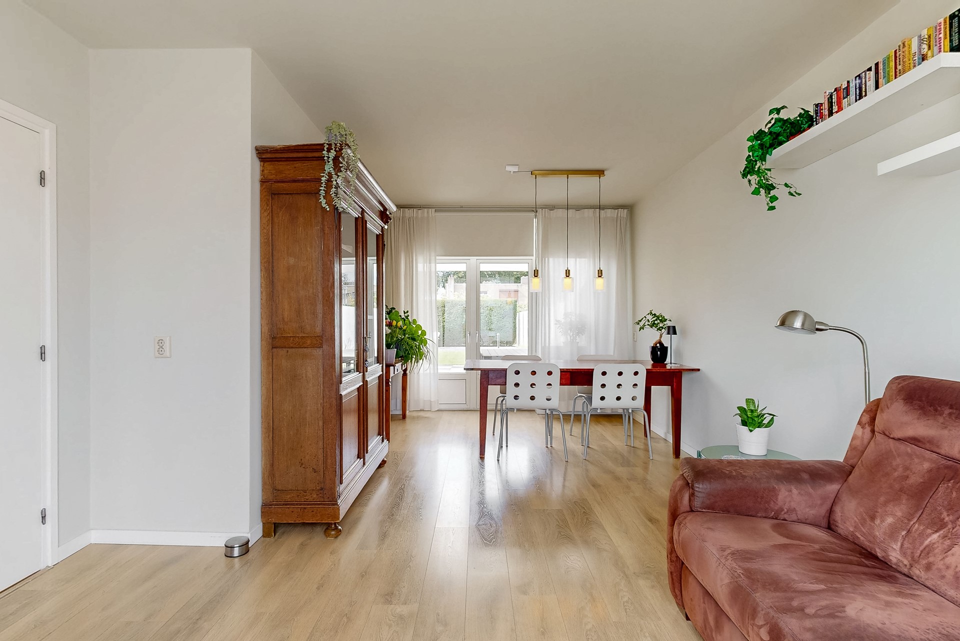 De woonkamer heeft een laminaatvloer en deur naar de tuin. De gesloten keuken is voorzien van een tegelvloer, deur naar de tuin en eenvoudige, witte aanbouwkeuken.