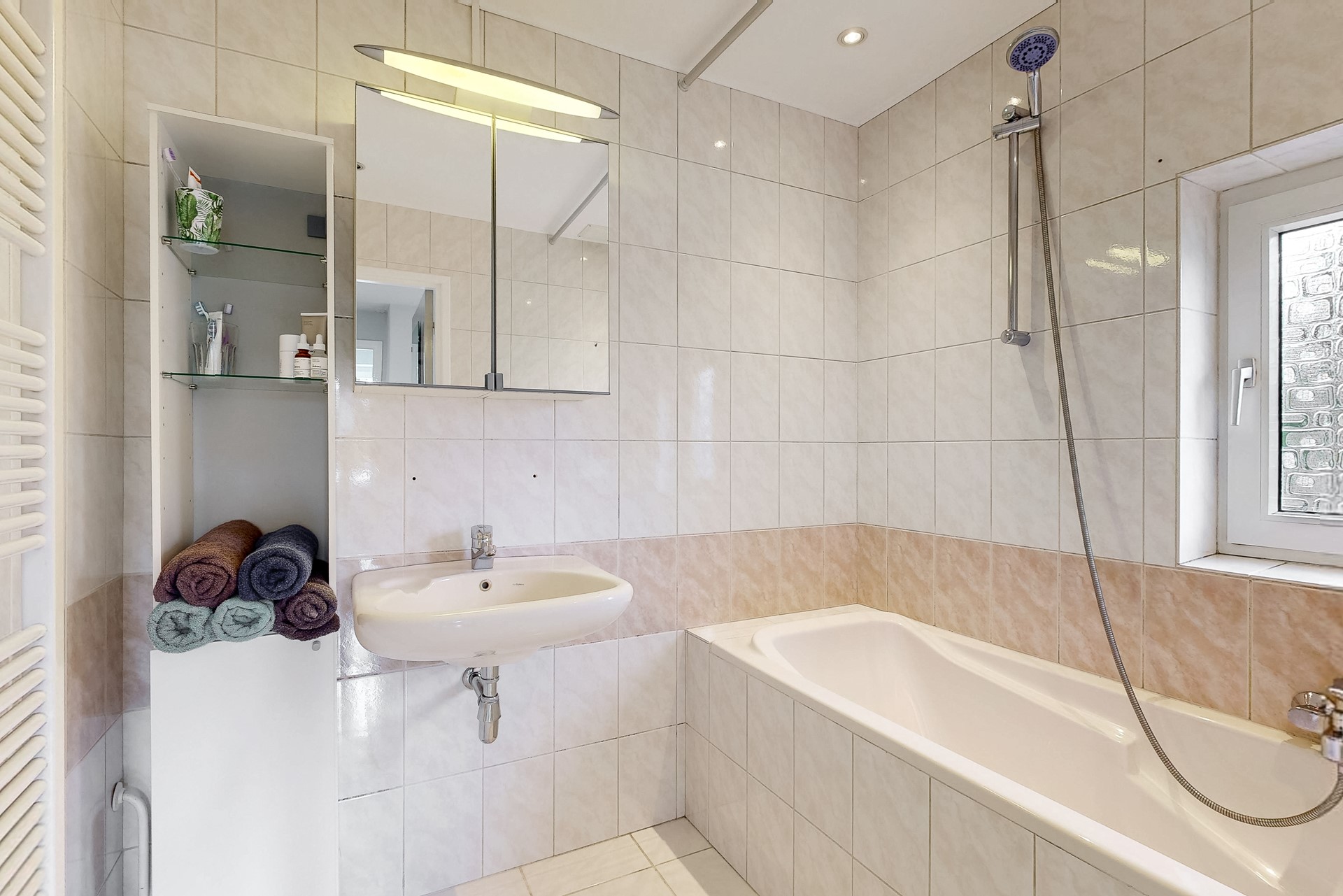 De badkamer is licht betegeld en voorzien van een ligbad en wastafel.
